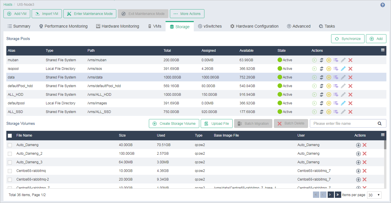 As a best practice, upload the ISO image file of an operating system to the shared storage pool. When creating a VM on any host that has mounted the shared storage pool, operators can use the image file to install the operating system for the VM. If the ISO image file is uploaded to a storage pool of the Local File Directory type (such as defaultpool or isopool), only the VM on this host can use the ISO image file to install the operating system.