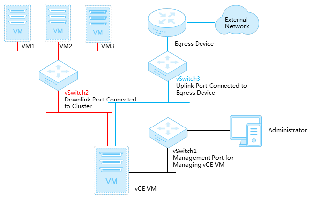 vSwitch 3 will be connected to the uplink port of the vCE VM. The uplink port is attached to a firewall or router that provides access to the external network.