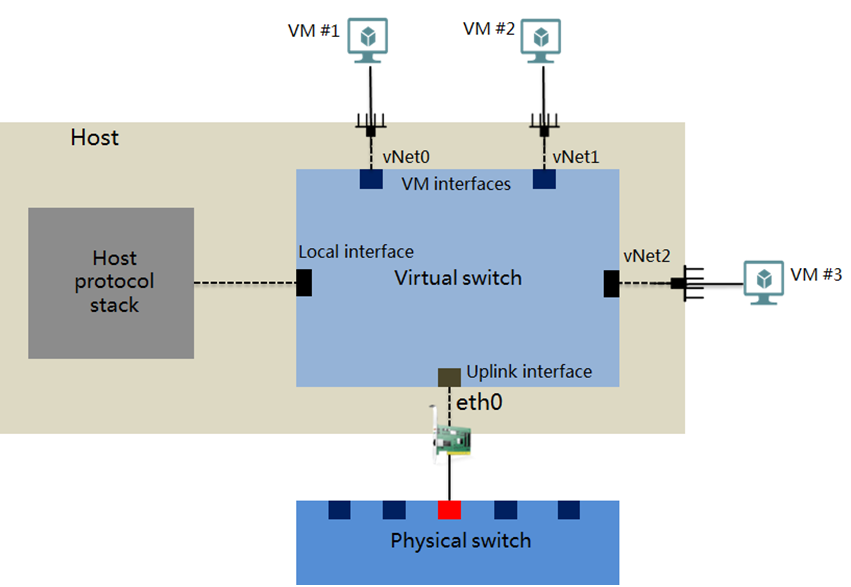A virtual switch provides software-based switching between VMs, hosts, and the external network.