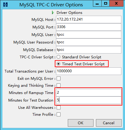 Select Timed Test Driver Script, and set the rampup time to 2 minutes and test duration to 5 minutes.