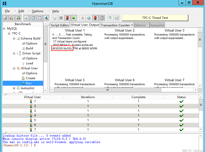 Make sure the status of each virtual user is not a red cross. A red cross indicates errors. When workers are finished, the monitoring thread will create indexes and storage procedure and collect statistics. The TPCC SCHEMA COMPLETE message will displayed for virtual user 1, and operations will be completed for the other virtual users. If not, check the error details in the area at the bottom and resolve problems. |