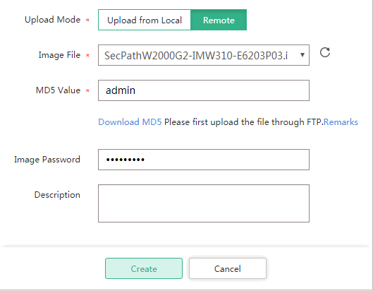 If you select Remote, upload an image file through FTP or SFTP. To obtain the address of the FTP server and the MD5 value, see the remarks.
