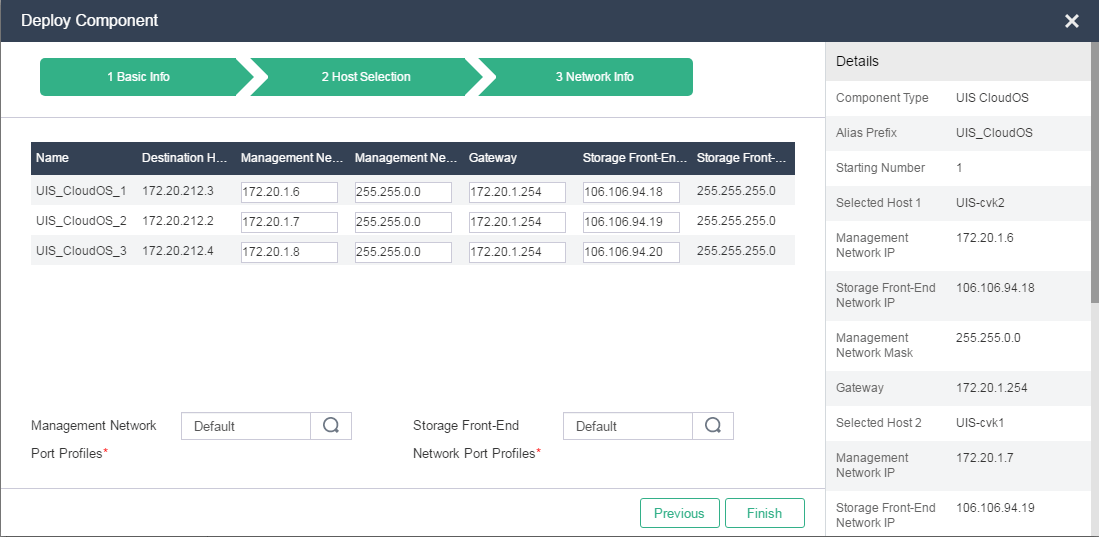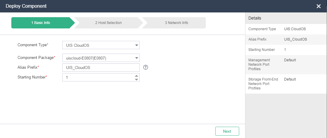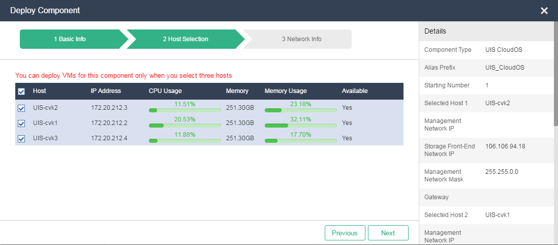 Click Next, and then select three hosts to deploy UIS Cloud VMs.