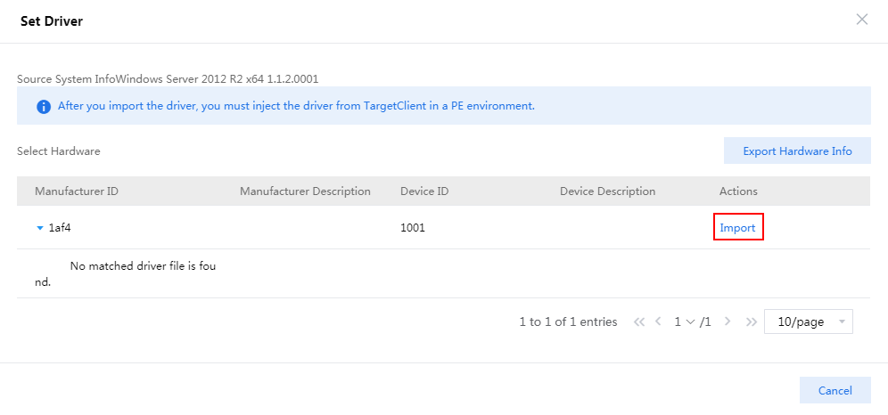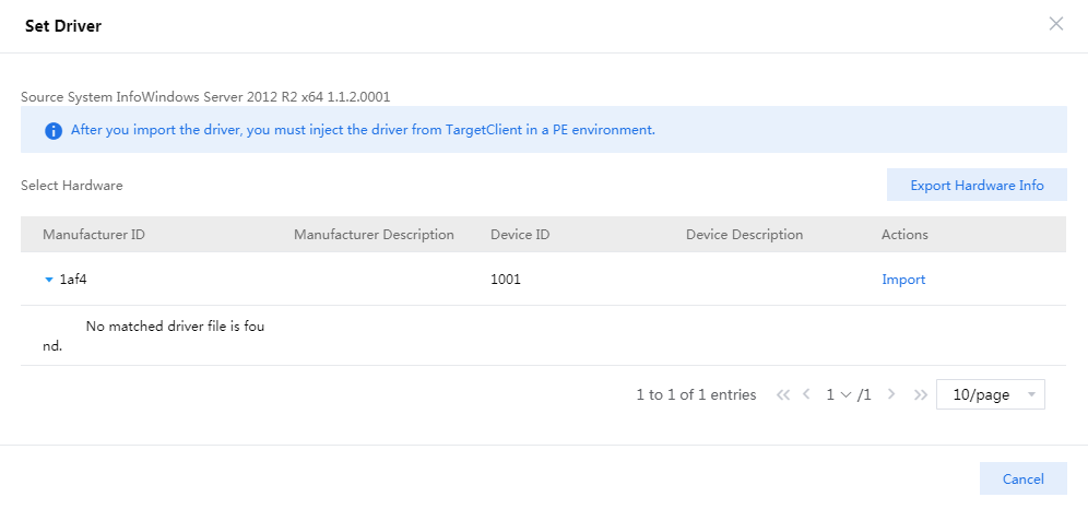 The system can detect disk driver incompatibility risks for a migration task. You can export information about the hardware that might have driver incompatibility issues and import drivers for the hardware to the destination VM.