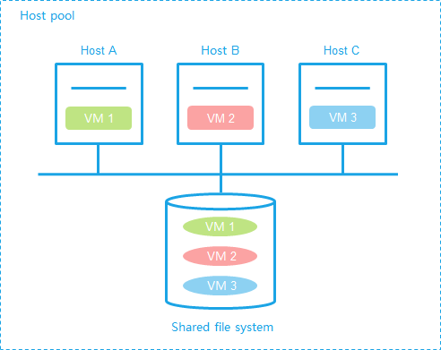 A minimum of one host uses the shared file system as a storage pool.