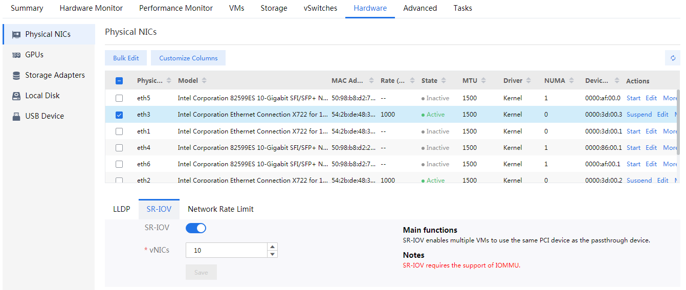 Click the Hardware Monitor tab, select physical interfaces, enable SR-IOV, set the number of virtual NICs, and click Save.