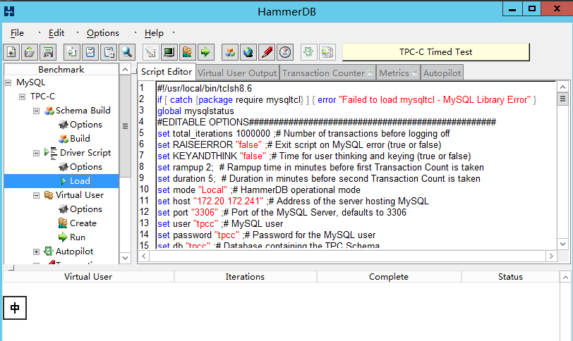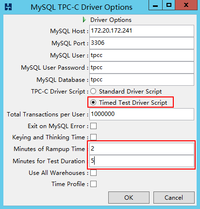 Select Timed Test Driver Script, and set the rampup time to 2 minutes and test duration to 5 minutes.