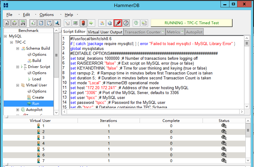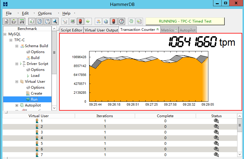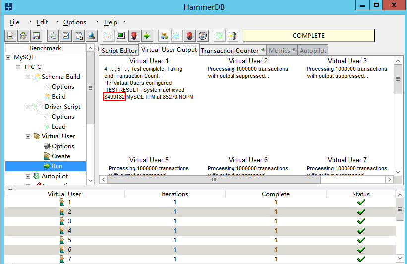 Make sure the status of each virtual user is not a red cross. A red cross indicates errors. When workers are finished, the monitoring thread will create indexes and storage procedure and collect statistics. The TPCC SCHEMA COMPLETE message will displayed for virtual user 1, and operations will be completed for the other virtual users. If not, check the error details in the area at the bottom and resolve problems. |