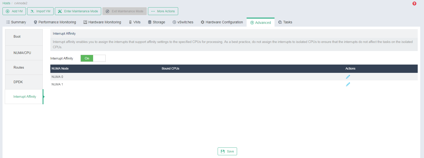 Interrupt affinity enables you to assign the interrupts that support affinity settings to the specified CPUs for processing. As a best practice, do not assign the interrupts to isolated CPUs to ensure that the interrupts do not affect the tasks on the isolated CPUs.