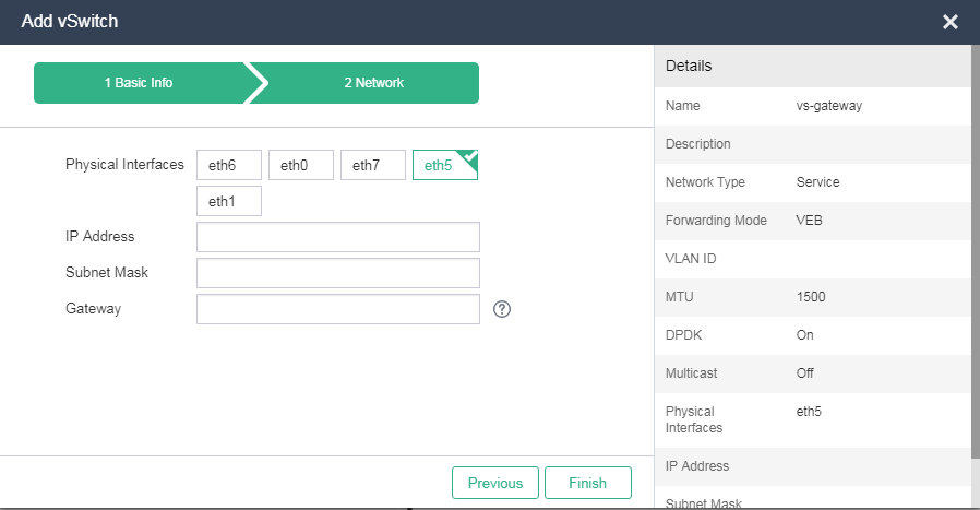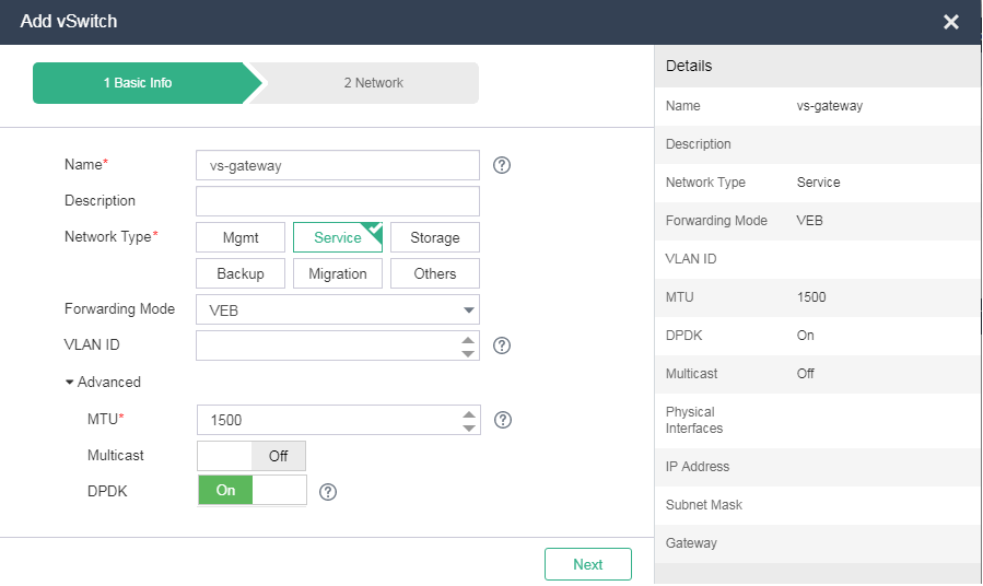 Specify the vSwitch name as vs_gateway, select Service as the network type, and enable DPDK in the Advanced area.