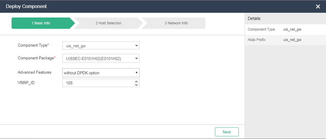 Component Type: Select uis_net_gw as the component type to deployment UIS-Sec gateway component VMs. The VMs act as network nodes for the UIS standard edition or UIS Cloud to provide routers, LB services, firewalls, and public IP addresses for tenants.