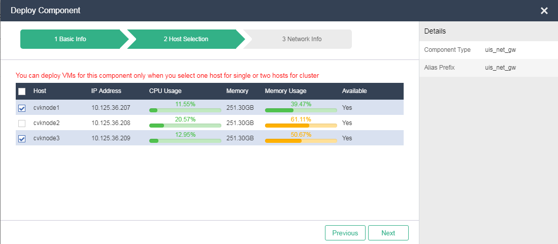 Host Selection: Select one host for standalone deployment or two hosts for cluster deployment. You can deploy a maximum of two component VMs in one deployment task.