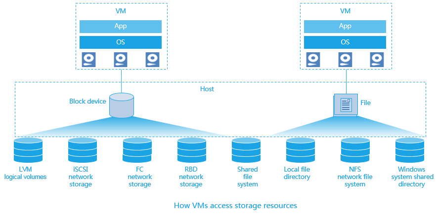 For LVM logical storage volume, iSCSI network storage, FC network storage, and RBD, VMs use their storage resources as block devices.