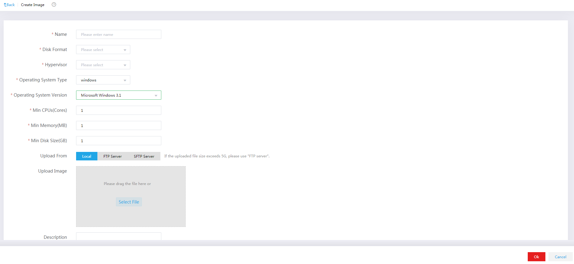 On the Public Image or Private Image page, click Create to upload a public or private image.
