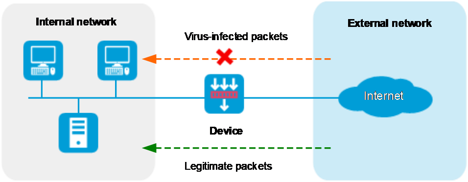 In this scenario, you can configure anti-virus on the gateway to protect the internal network. Anti-virus inspects incoming packets, permits legitimate packets to pass, and takes actions, such as alert, block, or redirect, on packets containing viruses.