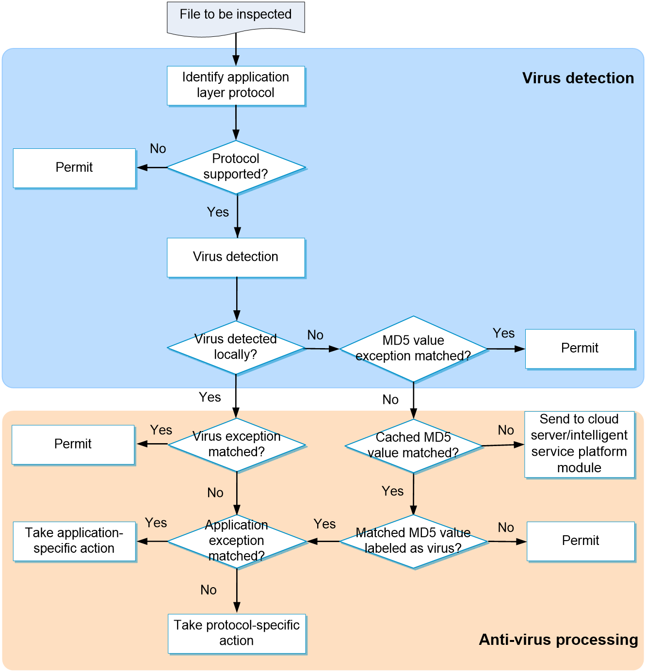 MD5 rule-based detection—The device generates an MD5 hash value for a file to be inspected and compares the value with the system-defined MD5 rules. If a match is found, the file is identified to be virus-infected.