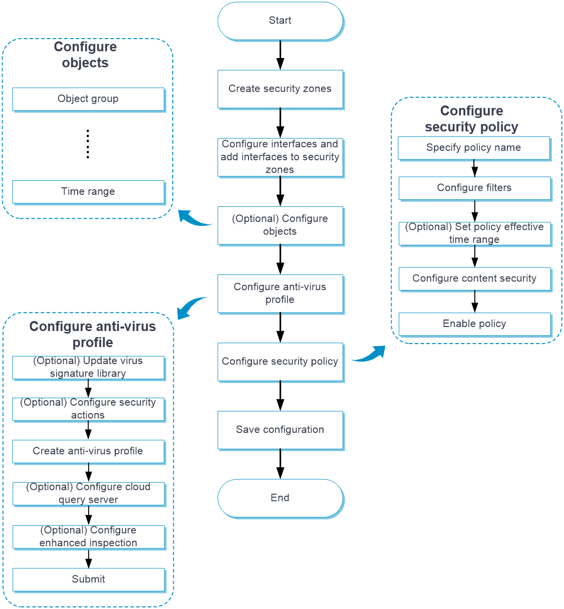 To use the anti-virus feature, you must purchase and install the required license. After the license expires, the anti-virus feature is still available but you can no longer update the virus signature library on the device or use the cloud query, enhanced inspection, or sandbox collaboration features. For more information about licensing, see the license management help.