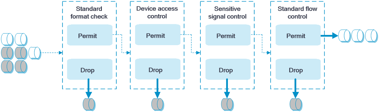 If a device is configured with more than one of the above features, the device processes a packet in the sequence of standard format check, device access control, sensitive signal control, and standard flow control.