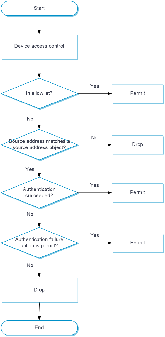 Source Address Check | Configure source address object groups to filter out devices for standard format check. The device performs standard format check on packets that match any configured source address object group. | |