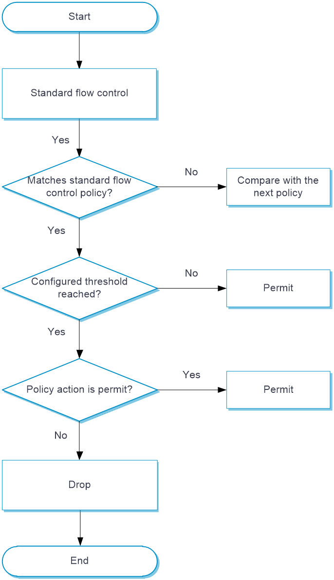 If a packet fails to match one of the criteria types in a policy, the packet continues to compare with the next policy until it is successfully matched. If the packet fails to match any of the policies, standard flow control is not required.