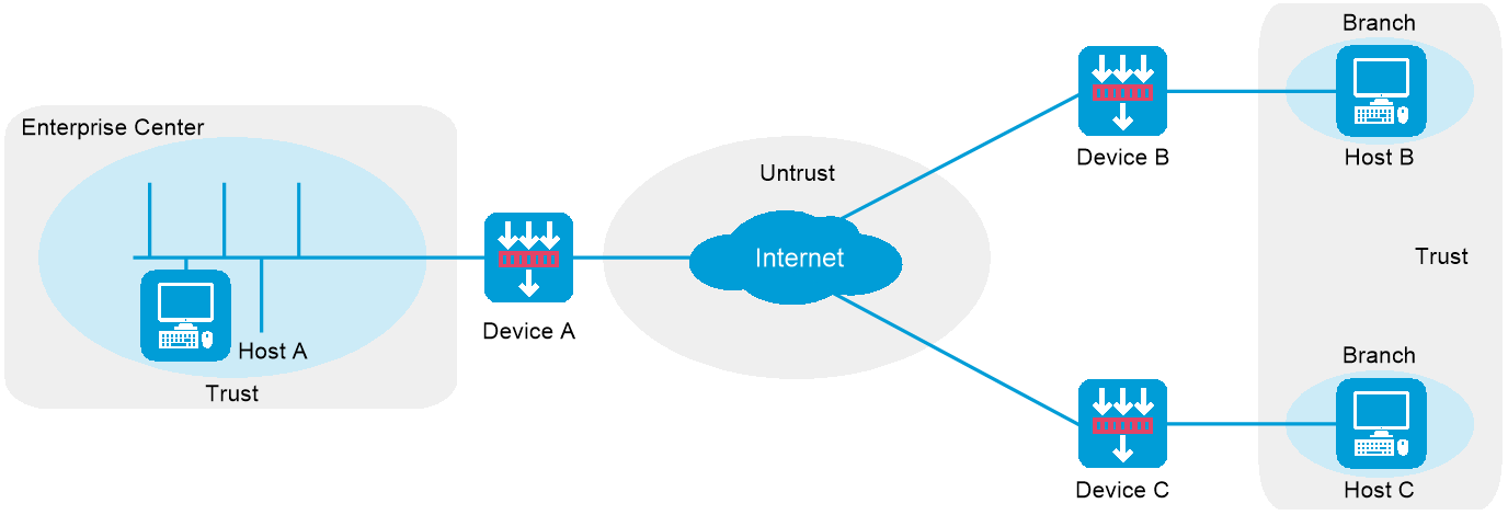 IPsec supports the P2P or P2MP networking mode. As shown in Figure-2, in P2MP mode, Host A is at the enterprise center, and Host B and Host C are at two branches of the enterprise. Configure an IPsec tunnel between the headquarters gateway and each branch gateway to protect the traffic between Host A and each branch host.