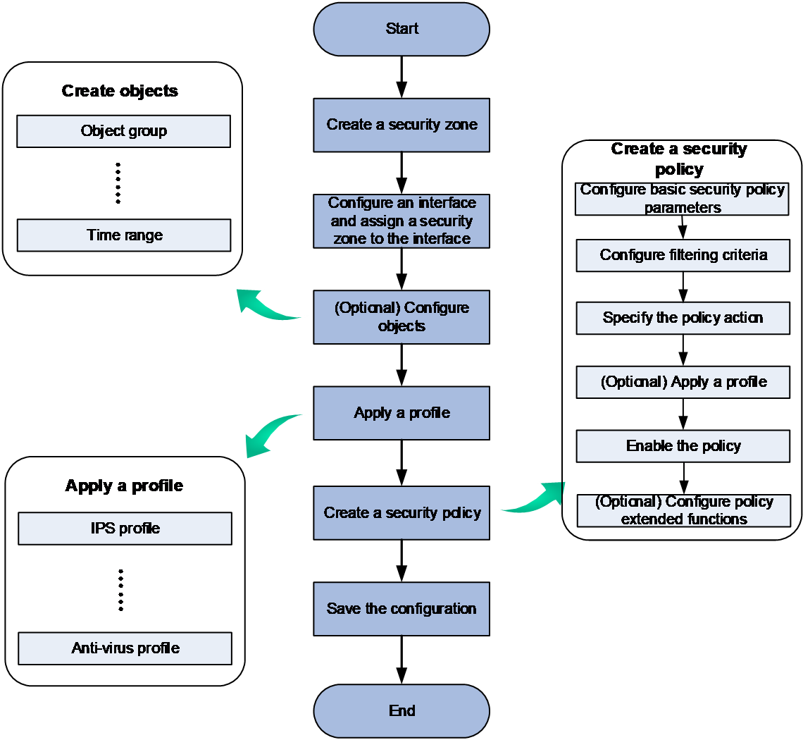 The security policy is a control strategy that forwards and conducts Deep Packet Inspection (DPI) based on the attributes of the packets. It uses various filtering criteria (such as source/destination security zones) to precisely match the packet attributes and processes the matched packets according to specified actions. The feature is widely applied in scenarios such as enterprise networks and data centers, providing comprehensive protection for network security.