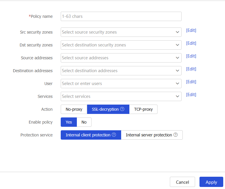 Select a protection service of the SSL decryption as required and import the corresponding certificates to the device for SSL connection establishment with the clients.