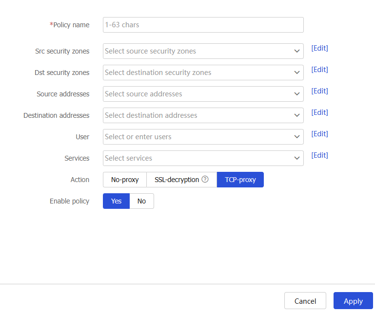 The device supports TCP proxy and SSL proxy functions. You can configure a proxy policy and set the policy action to