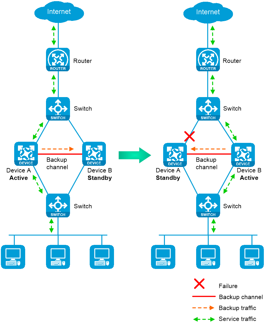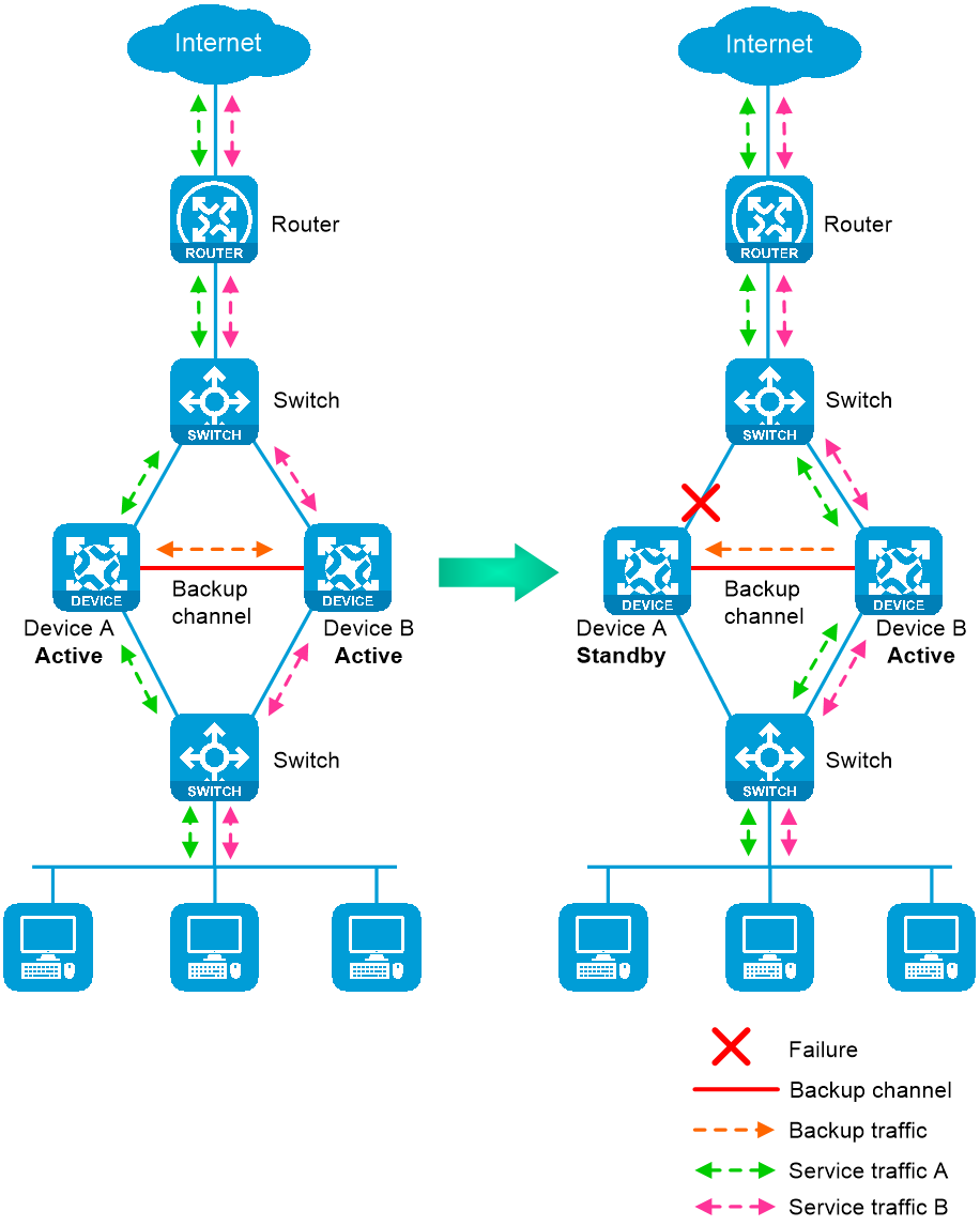 In active/standby mode, one device is active to process services, and the other device stands by, as shown in Figure-1. When an interface or link on the active device fails or when the active device fails, the standby device becomes active to process services.