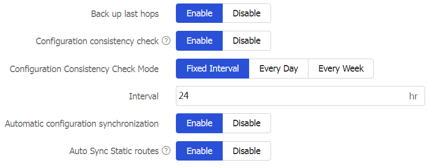 Auto Sync Static routes | Use this function only in mirroring mode or when hot backup and virtual IP addresses are used in combination to direct traffic. Do not use it in any other scenarios. Enable the primary device to send static routes to the secondary device during automatic or manual configuration synchronization.