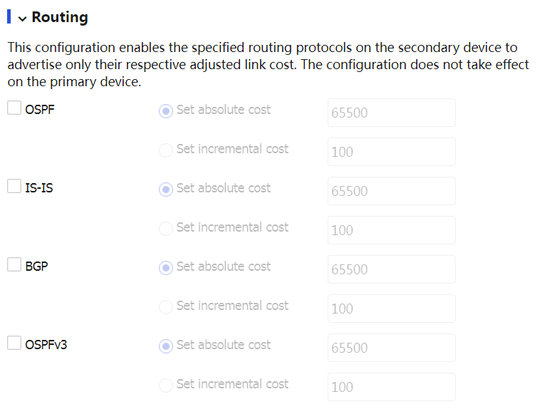 Set absolute cost | Enter an absolute link cost. The hot backup system will use this value to replace the link costs to be advertised. |