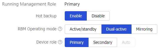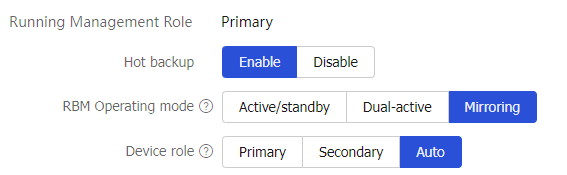 Device role | Assign hot backup roles to the member devices in the hot backup system. In a hot backup system, the hot backup role of one device must be primary, and the other secondary. To use automatic hot backup role assignment, you must enable automatic hot backup role assignment on both devices. The hot backup system supports both manual and auto modes for device role selection.