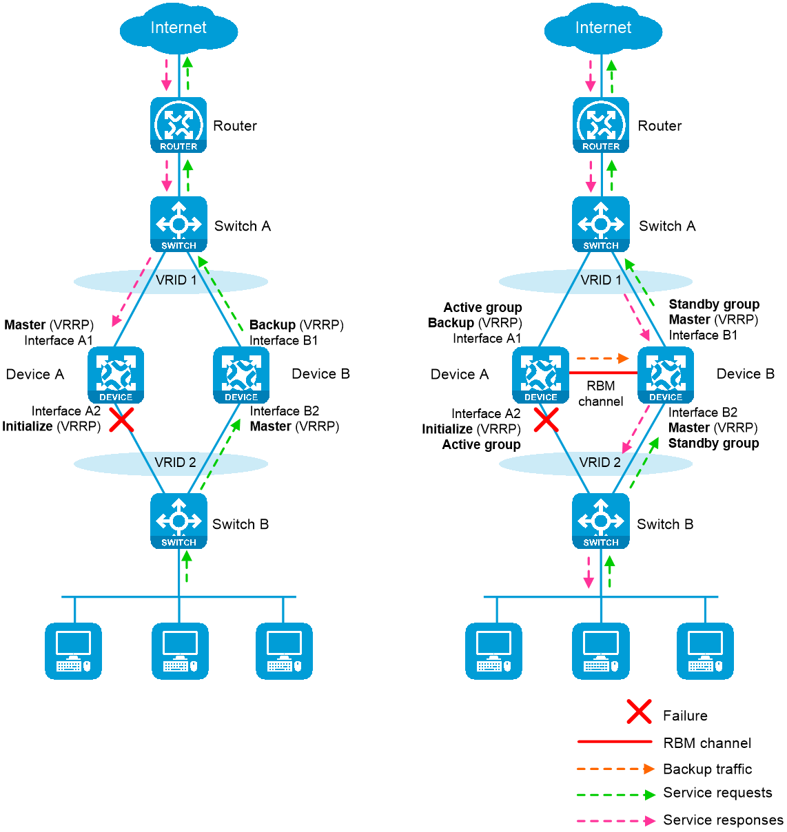 You must associate RBM with Track in the network environment. Without the configuration, active/standby switchover cannot be performed upon uplink or downlink link or interface failures. For more information about the configuration, see "Configure the hot backup system to collaborate with a routing protocol."