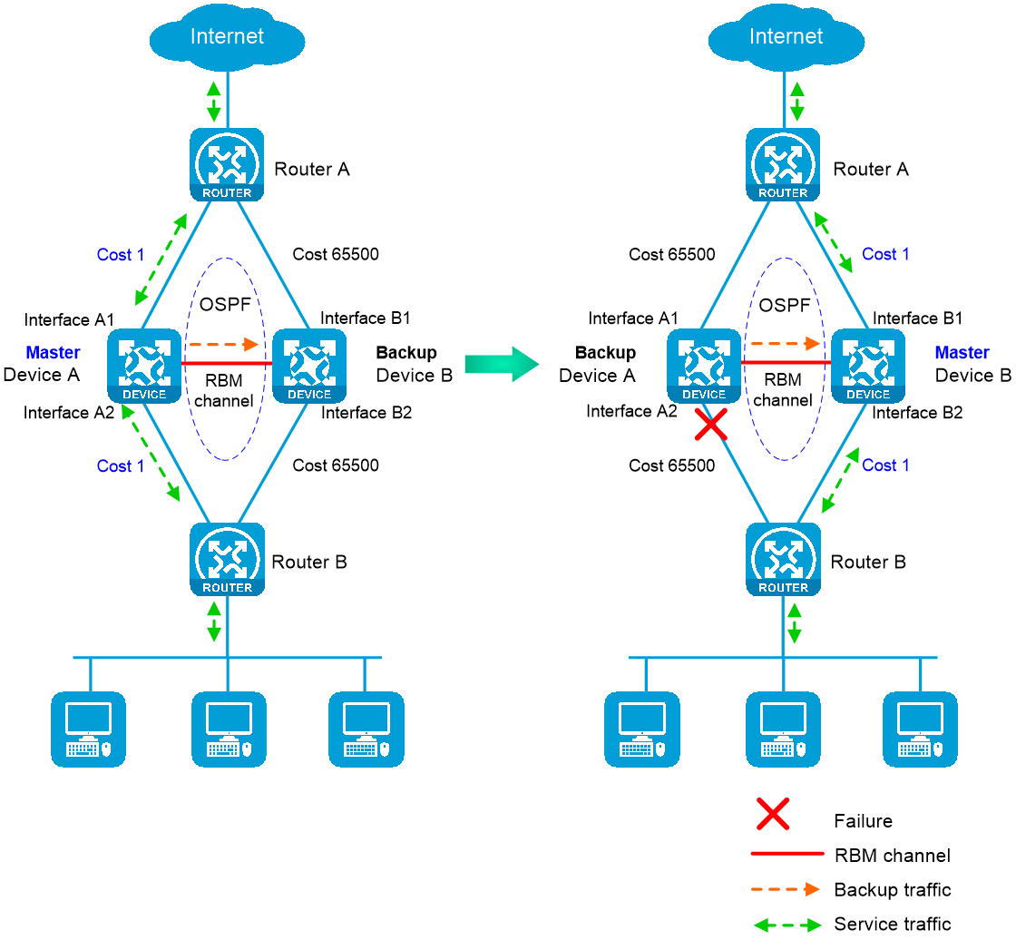 As shown in Figure-5, when downlink Interface A2 of Device A fails, Device A and Device B switch their states. Then, Device B (active) advertises the original link cost 1, and Device A (standby) advertises the adjusted link cost 65500. As a result, Device B forwards all traffic that traverses the hot backup system.