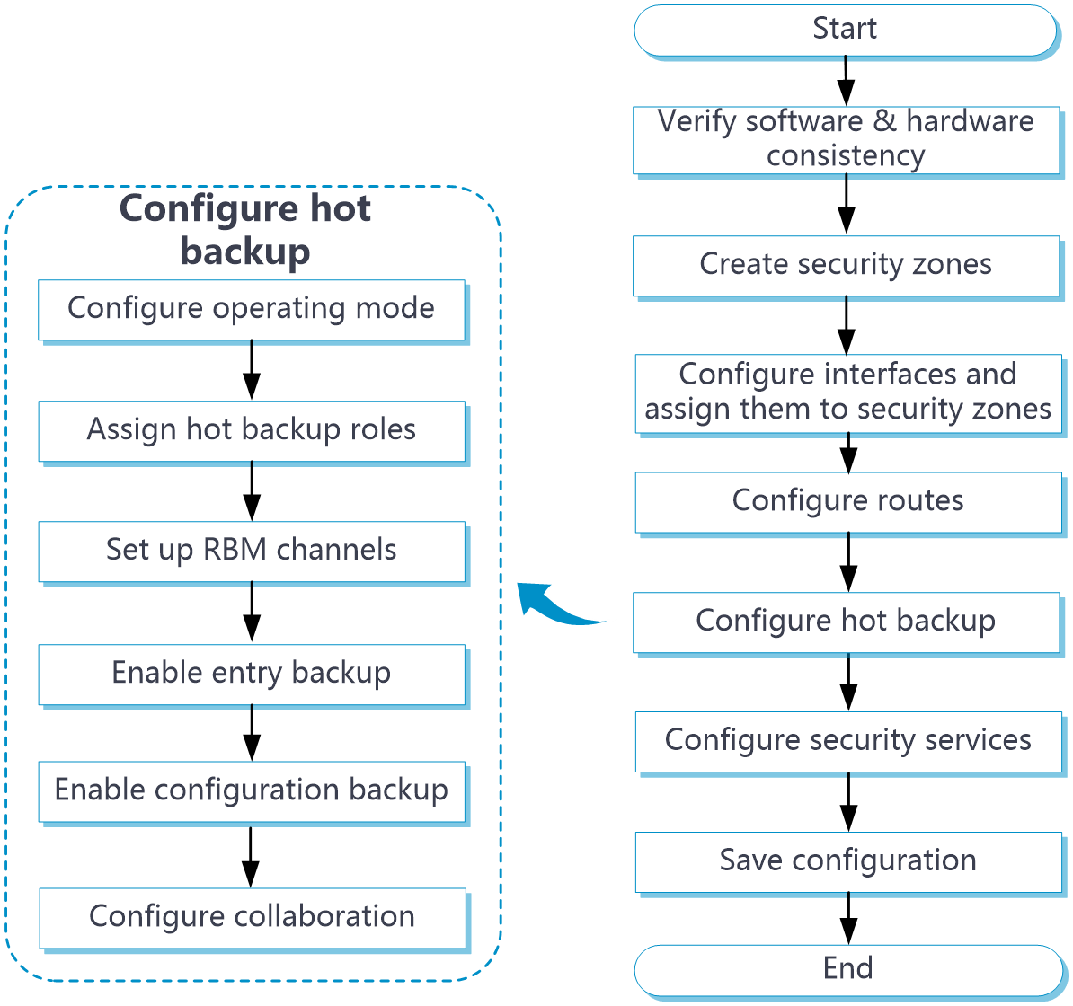 The hot backup system works with RBM to manage multiple VRRP groups or adjust the link costs for routing protocols on two member devices to ensure that the devices have consistent roles and states. The hot backup system can synchronize important configuration and service entries between the devices to ensure service continuity. Two devices must have the same software and hardware environments to join the hot backup system.