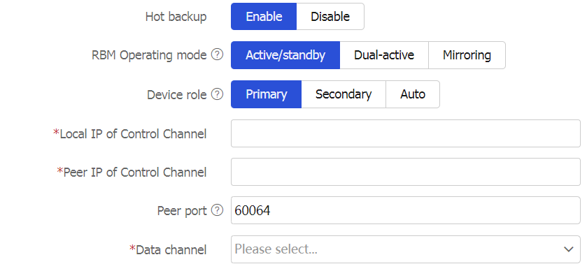 Peer port | Enter the port number for the control channel. The hot backup member devices must have the same port number. |
