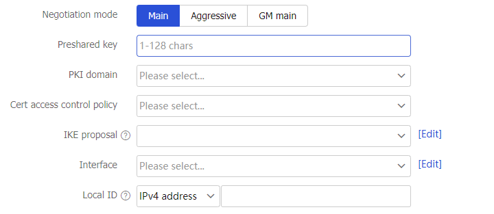 Phase 1 negotiation can use the main mode, aggressive mode, or GM main mode. The aggressive mode is faster than the main mode but it does not provide identity information protection. The main mode provides identity information protection but is slower. Choose the appropriate negotiation mode according to your requirements. The GM main mode must be used if the local IKE peer uses the RSA-DE or SM2-DE digital envelop authentication method.