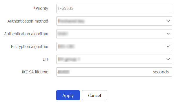 Priority | Specify the priority of the IKE proposal. The peer searches its own IKE proposals for a match. The search starts from the IKE proposal with the highest priority and proceeds in descending order of priority until a match is found. The matching IKE proposals are used to establish the IKE SA. If all user-defined IKE proposals are found mismatching, the two peers use their default IKE proposals to establish the IKE SA. |