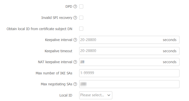 Keepalive interval | Specify the interval at which IKE sends keepalive packets to the peer. |