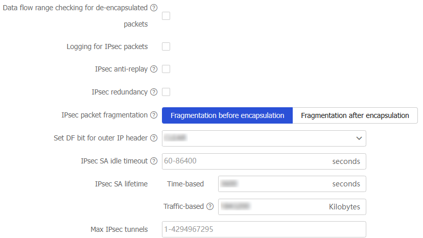 Max IPsec tunnels | Set the maximum number of IPsec tunnels. To maximize concurrent performance of IPsec when memory is sufficient, increase the maximum number of IPsec tunnels. To ensure service availability when memory is insufficient, decrease the maximum number of IPsec tunnels. |