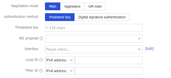 Local ID | Specify the local ID. The device uses the ID to identify itself to the peer during IKE negotiation. The local ID parameters configured on the local device must be the same as the peer ID parameters configured on the peer device. Options include: