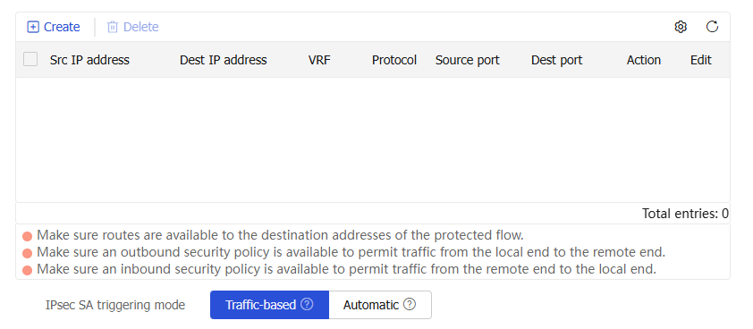 IPsec SA triggering mode | Specify the IPsec SA negotiation triggering mode. Options include: