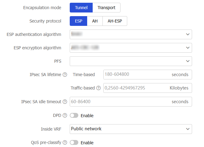 QoS pre-classfy | Specify whether to enable QoS pre-classify. With this feature enabled, QoS classifies packets by using the IP headers of the original IP packets. With this feature disabled, QoS classifies packets by using the new IP headers added by IPsec. |