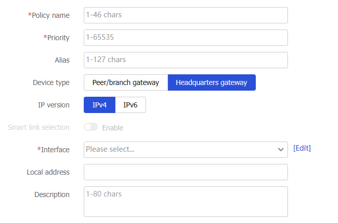 Interface | Specify the interface where the IPsec policy is applied. If you enable smart link selection, specify all interfaces to be selected on the local end for smart link selection. |