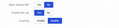 Allow reverse NAT | Allow reverse address translation. Reverse address translation applies to connections actively initiated by internal servers to the external network. It translates the private IP addresses of the internal servers to their public IP addresses. This option is available only when the mapping type is set to One single public address with one single or no public port. | |