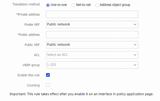 VRF | VRF to which the source addresses belong after translation. The default setting is Public network. You must specify this parameter if you deploy outbound dynamic NAT for VPNs. The specified VRF must be the VRF to which the specified interface belongs. |