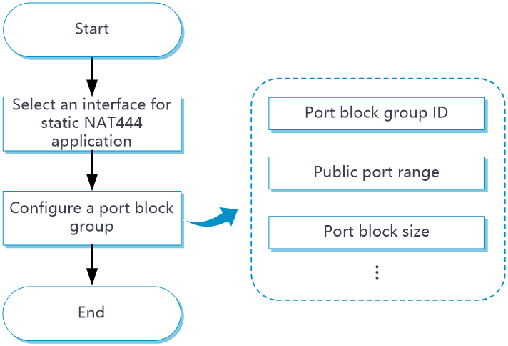 Dynamic port block mapping supports port block extending. If the ports in the port block for a private address are all occupied, dynamic port block mapping translates the source port to a port in an extended port block.