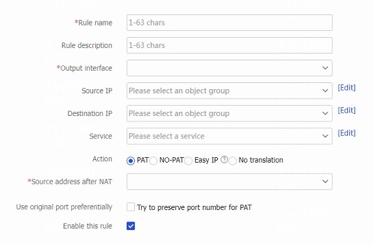 Service | Service object group for the NAT rule. You can configure multiple service object groups for a NAT rule. Each service object group is an independent packet match criterion. If you configure service object groups, source IP object groups, and destination object groups for a NAT rule, only packets with matching service type, source IP address, and destination IP address are translated. |