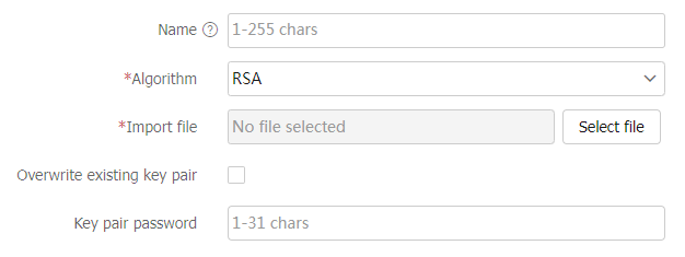 Overwrite existing key pair | Specify whether to overwrite the existing key pair if the name of the key pair to be imported is the same as that of an existing key pair using the same key algorithm. The name of a key pair must be unique among all manually named key pairs that use the same key algorithm. |