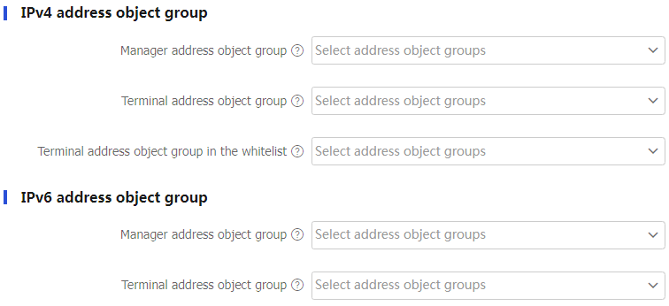 If you configure both a manager address object group or a terminal address object group, the manager address object group has higher priority.